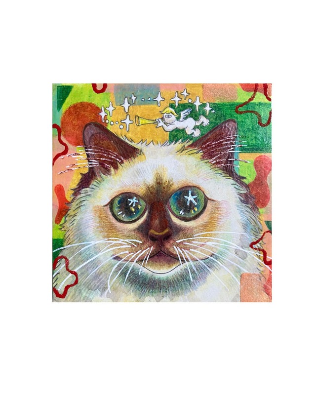 2025年制作 100mm×100mm/和紙に色鉛筆、岩絵具 ※額付きの場合、サイズは250mm×250mm。 ※額無しで購入を希望される方はお問い合わせください。 ______________________________ 天使ガブリエルは、スピリチュアルな文脈では、神の言葉を伝えるメッセンジャーであり、直感や夢を通じて重要なメッセージや導きをもたらすと信じられてきたそうです。迷いや不安を整理し、進むべき道に光をもたらしてくれる存在ともされています。猫という人々に愛される存在と、幸運を伝えるとされる天使ガブリエルをひとつの画面に描き、見る人に癒しを与えることを目的に描きました。