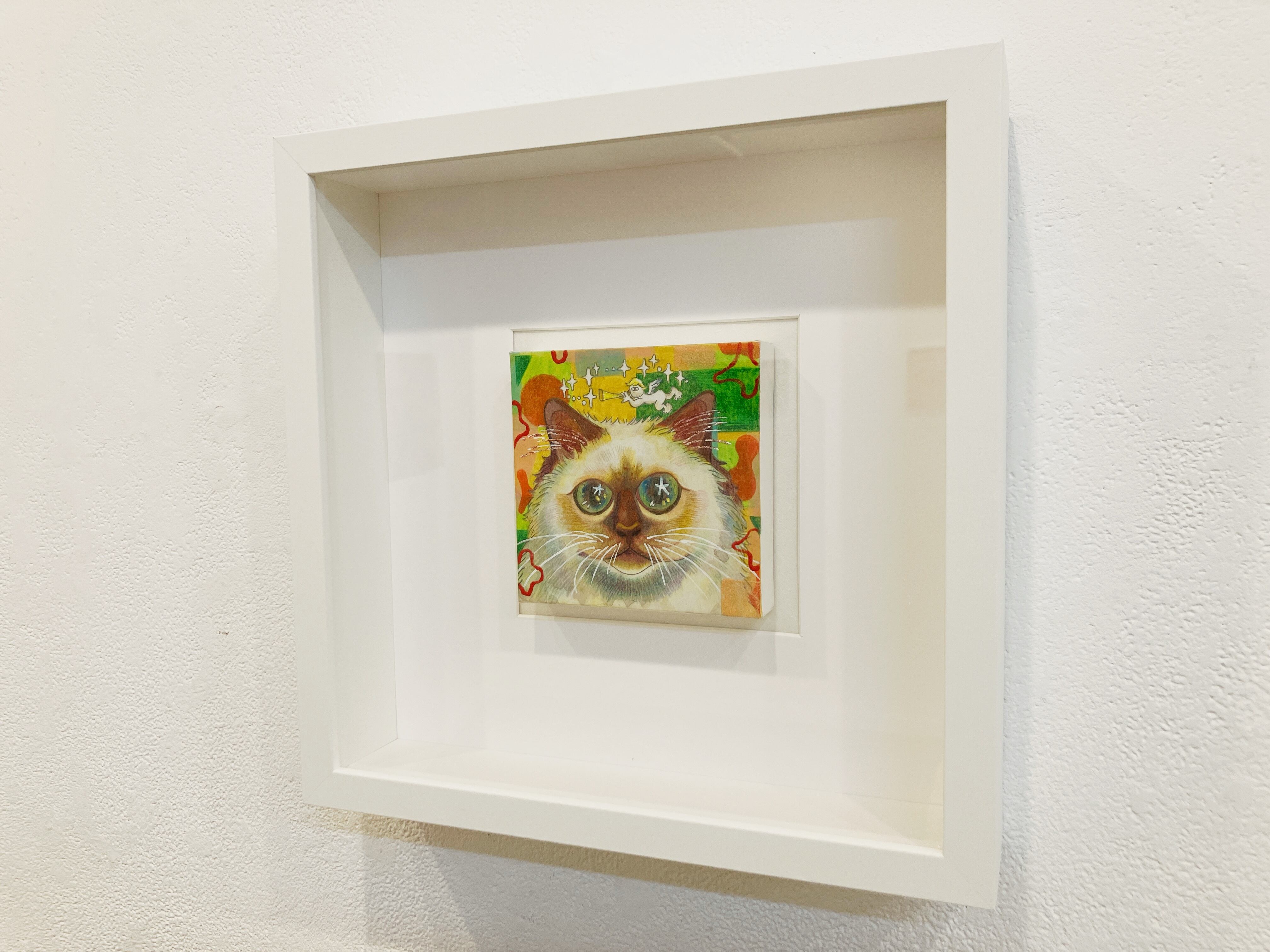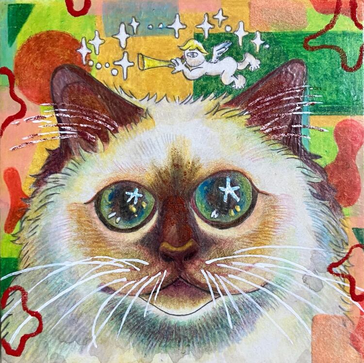 天使ガブリエルは、スピリチュアルな文脈では、神の言葉を伝えるメッセンジャーであり、直感や夢を通じて重要なメッセージや導きをもたらすと信じられてきたそうです。迷いや不安を整理し、進むべき道に光をもたらしてくれる存在ともされています。猫という人々に愛される存在と、幸運を伝えるとされる天使ガブリエルをひとつの画面に描き、見る人に癒しを与えることを目的に描きました。
