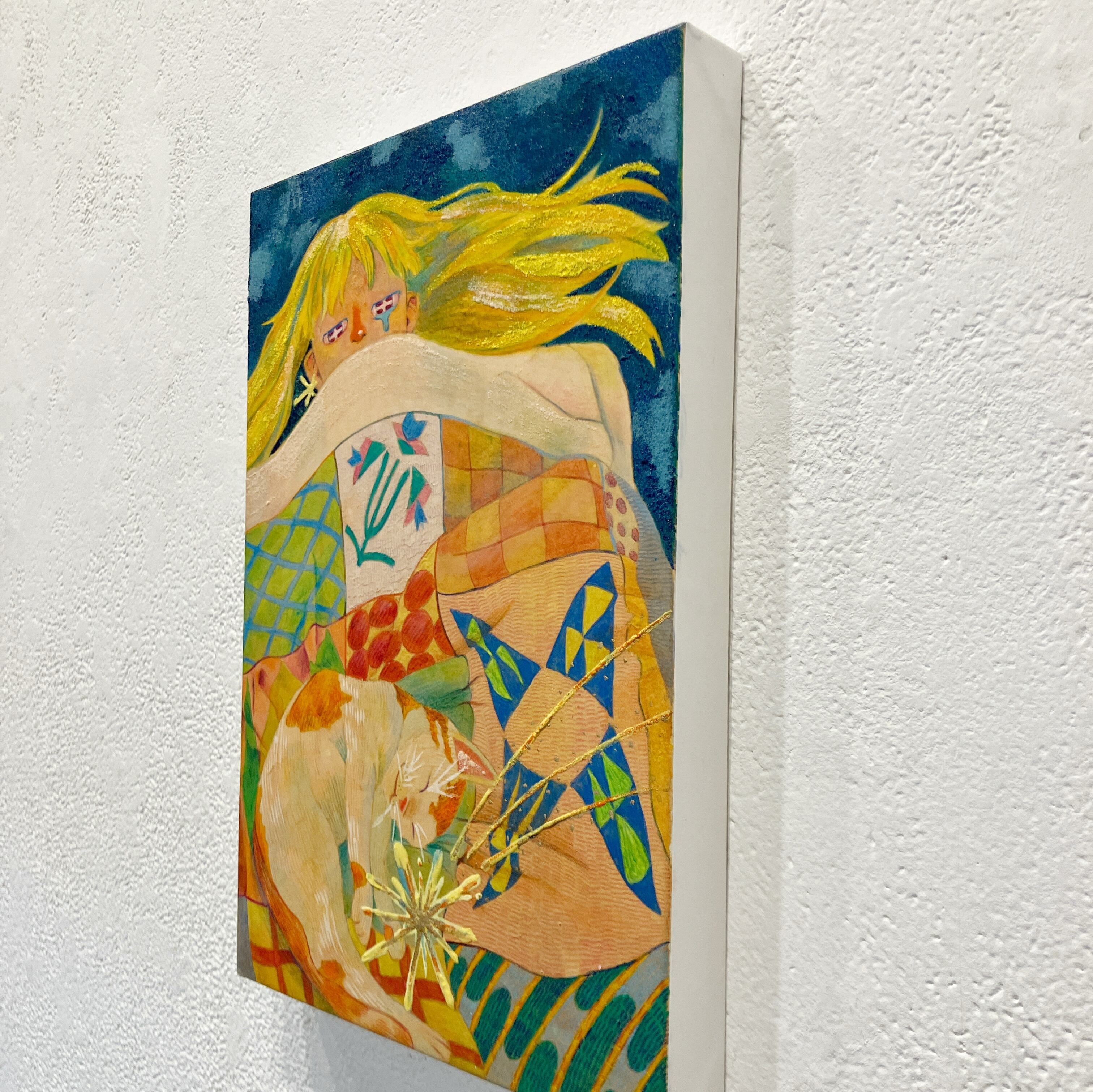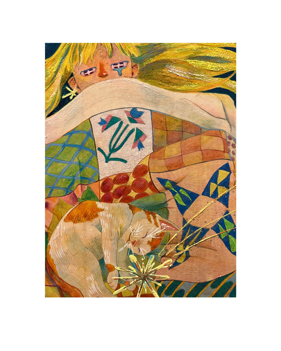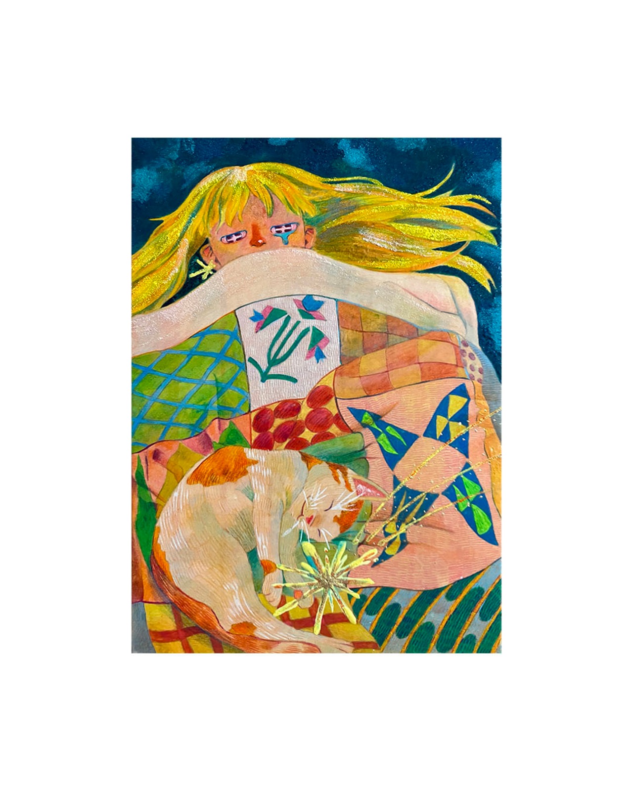 もしも私に愛猫がいたとしたら、孤独を感じる夜にそっと猫が寄り添ってくれたら、きっと嬉しさと温かさで心がほぐれるだろうなと想像して描きました。ふとした人の優しさや気遣い、ちょっと良いことがあったときにほろっと涙ぐんでしまう私自身の過去の経験を基に描いています。