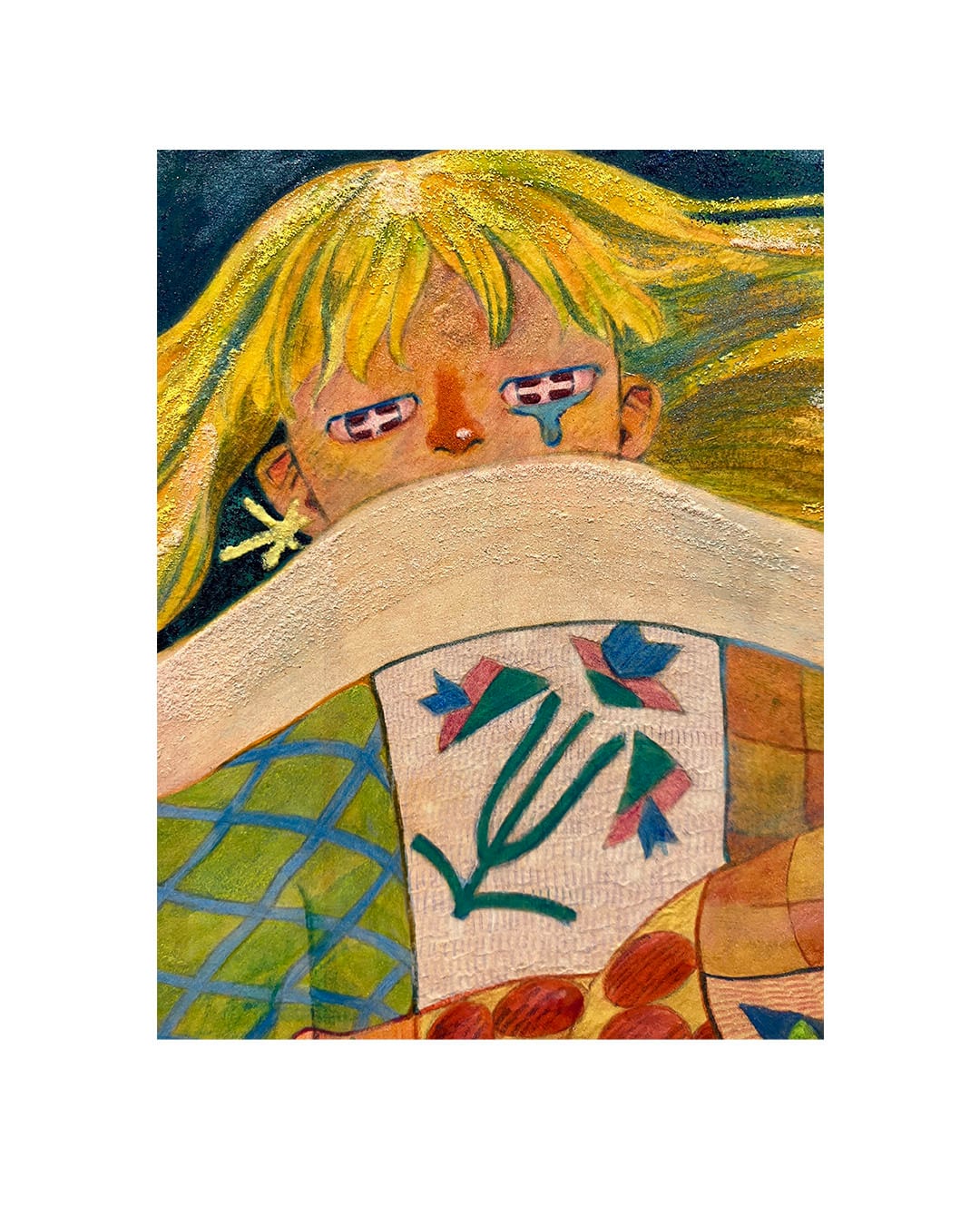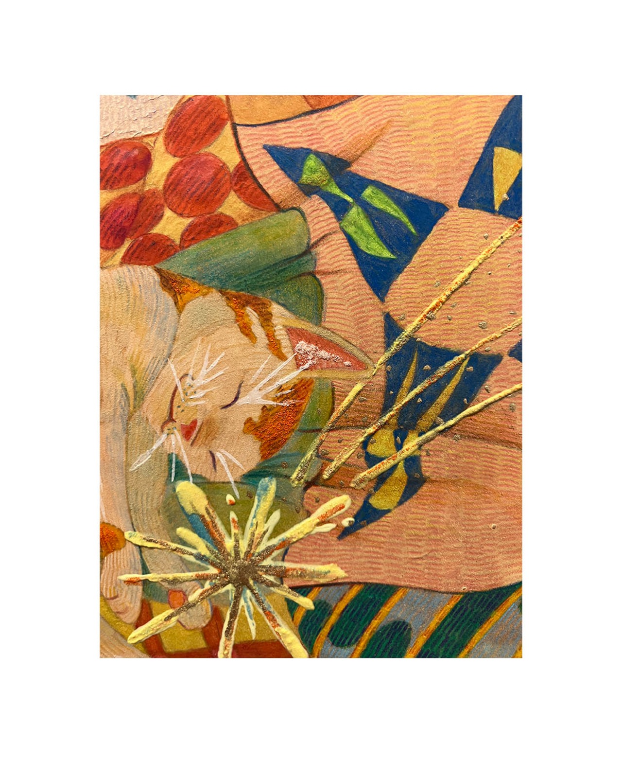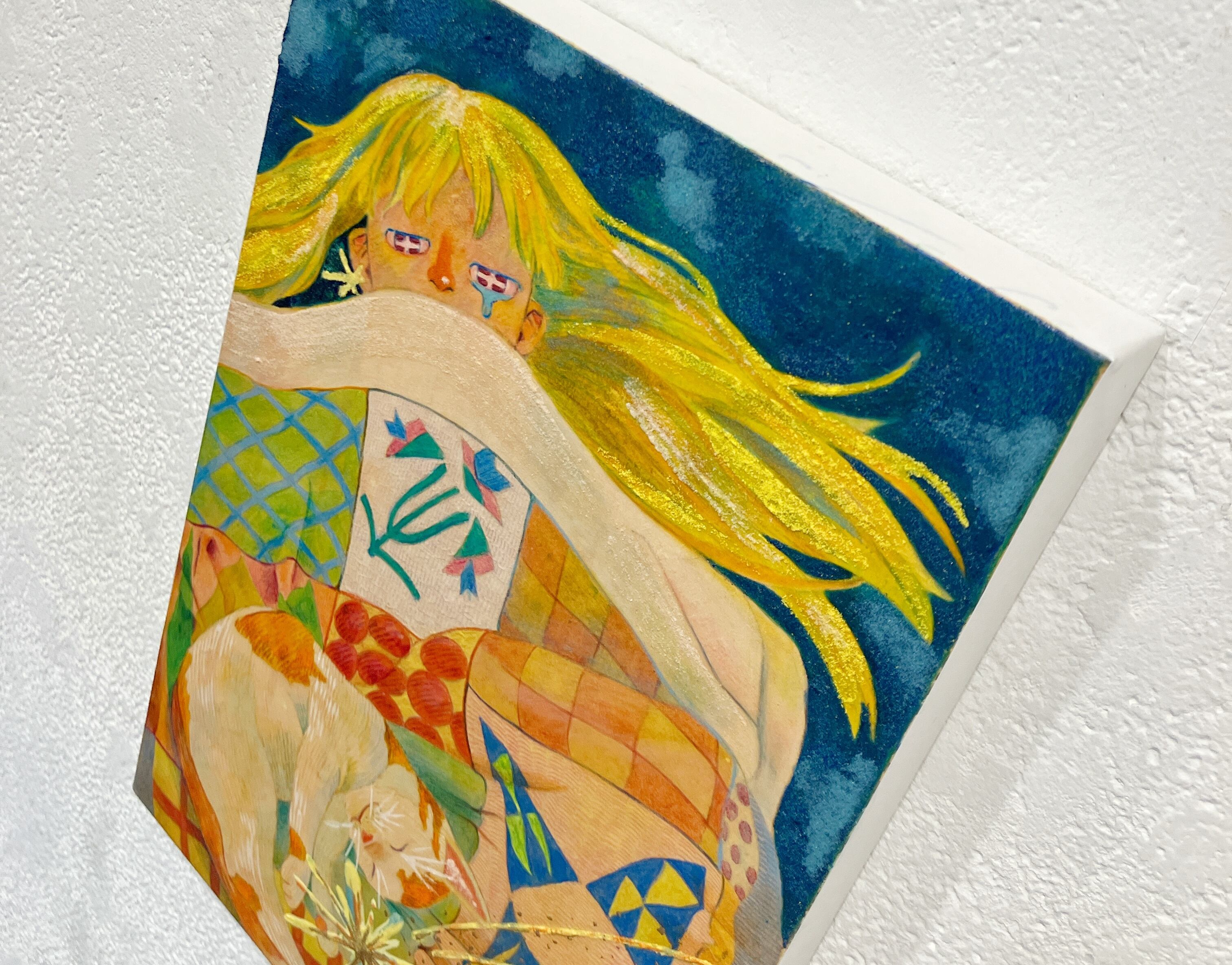 もしも私に愛猫がいたとしたら、孤独を感じる夜にそっと猫が寄り添ってくれたら、きっと嬉しさと温かさで心がほぐれるだろうなと想像して描きました。ふとした人の優しさや気遣い、ちょっと良いことがあったときにほろっと涙ぐんでしまう私自身の過去の経験を基に描いています。